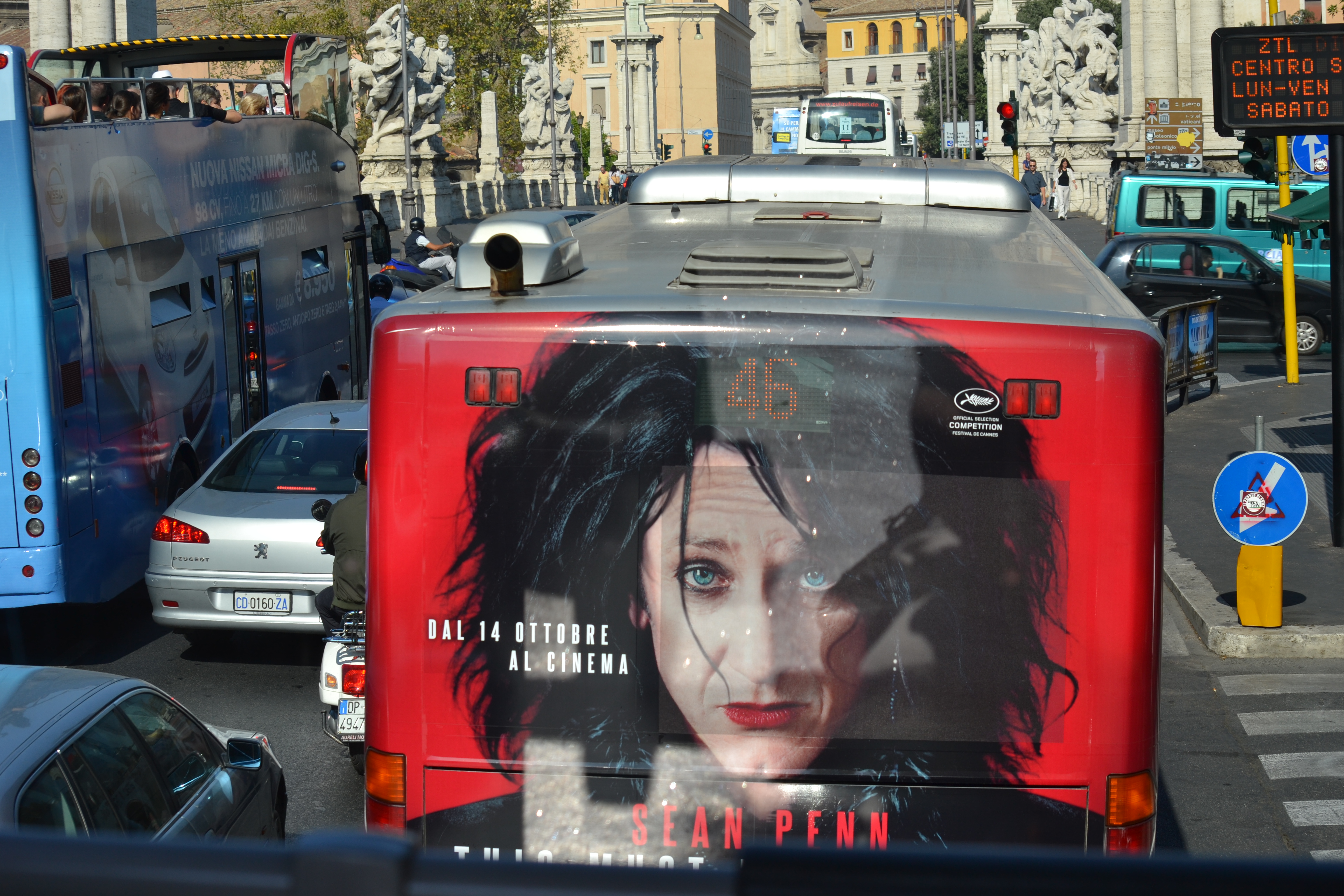 Speaking of movies, the picture below shows a movie that’s actually being released in Europe before the States. I saw a preview in Italian on TV and it really peaked my interest. But now I have to wait until December! The other pictures show other ads on the back of busses on our travel through Rome. We got very up close and personal with most of them as the tour bus would stop only about a foot away from them, so as to not let the scooters or pedestrians pass through.