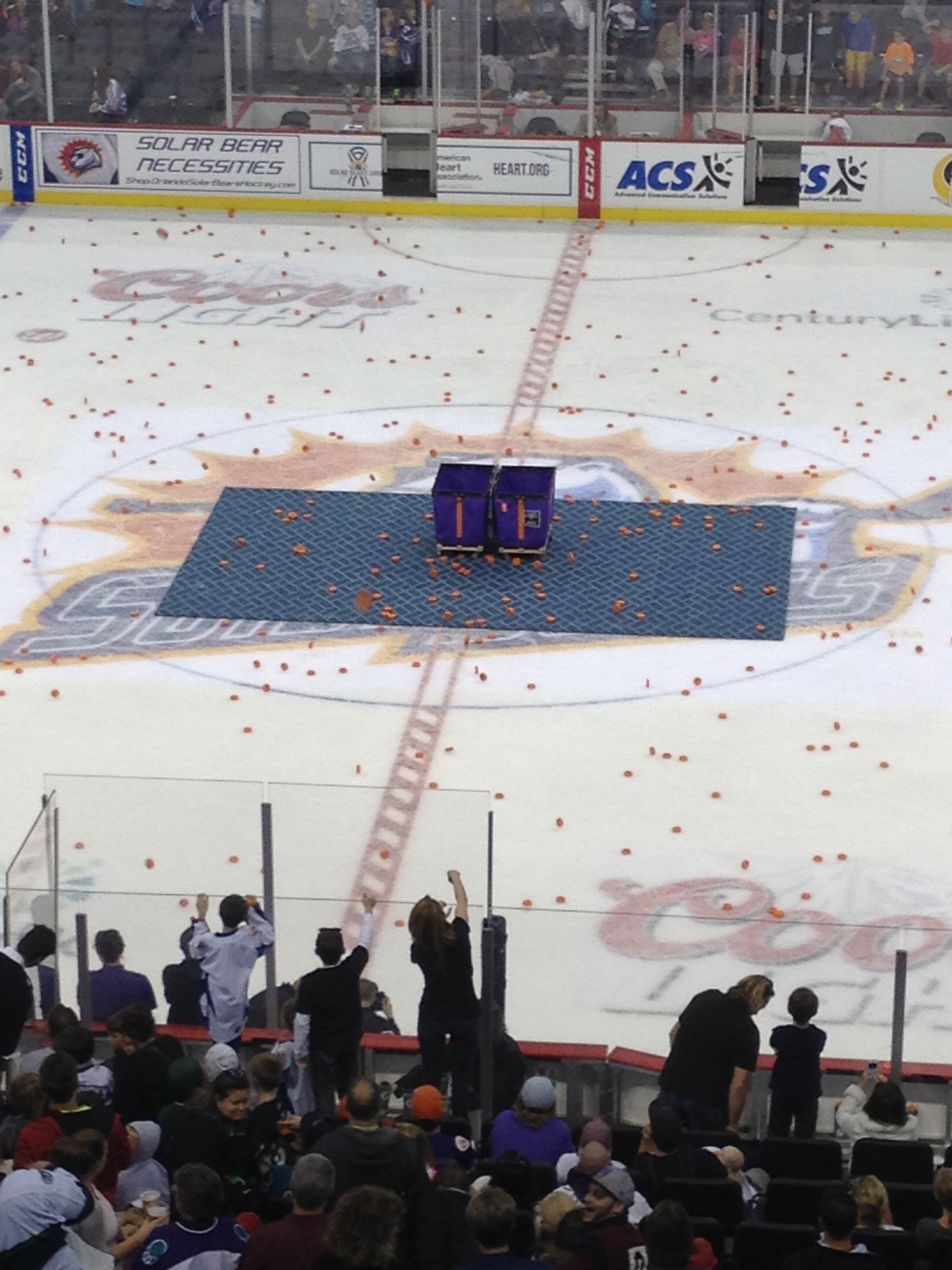 Another promotion which confused me was for someone to win something after they had donated to a charity. When you walked into the arena, you could donate money to the charity, be given an orange rubber puck with a number on it, and then at the designated time, you could throw that puck onto the ice and if it landed in a bin, you’d be eligible to win a prize. Sounds fine, right? But look what happened.