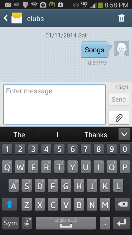 Everyone pulls out their cell phones and this is where the problem happened. Everyone with iPhones were able to type in the word “CLUBS” into the “To:” line and then “songs” in the message bar and the word CLUBS switched to the phone number 258-27. I then pulled out my friend’s Android (because I accidentally left my phone at home… eeek!) and wanted to do the same thing.